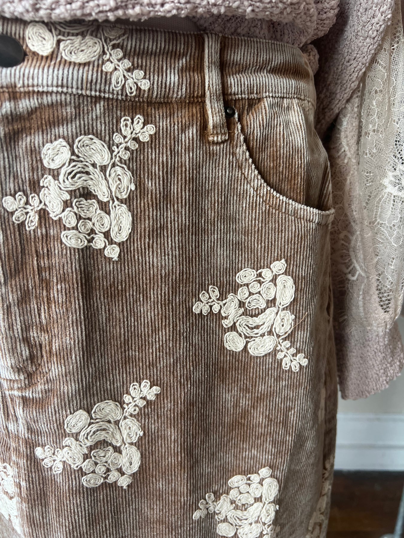 This corduroy skirt combines rich texture with intricate embroidered details for a stylish, unique look. Designed with a vent at the back, it offers both elegance and freedom of movement. Perfect for any season, this skirt effortlessly enhances your wardrobe with its blend of comfort and sophisticated design.