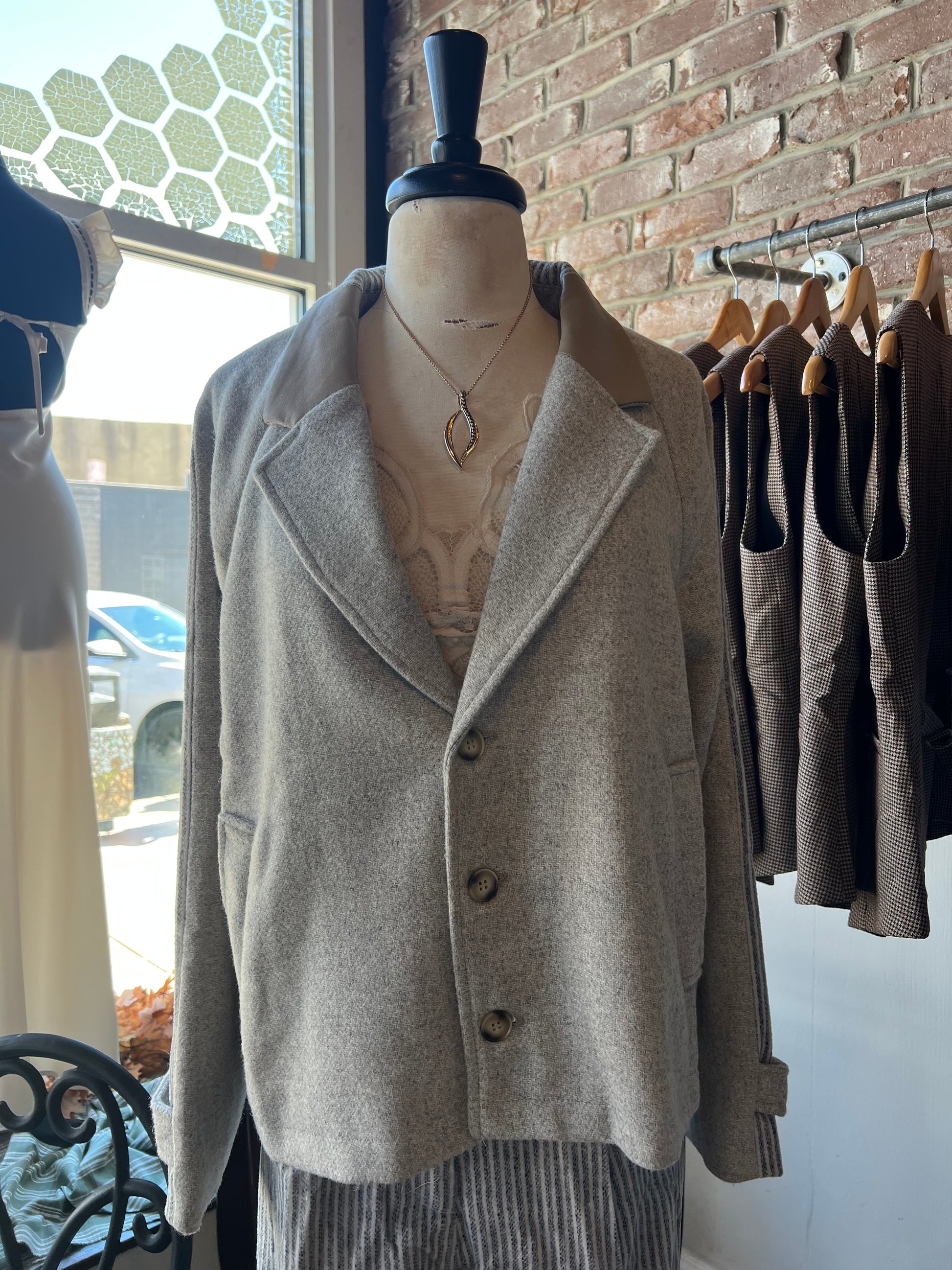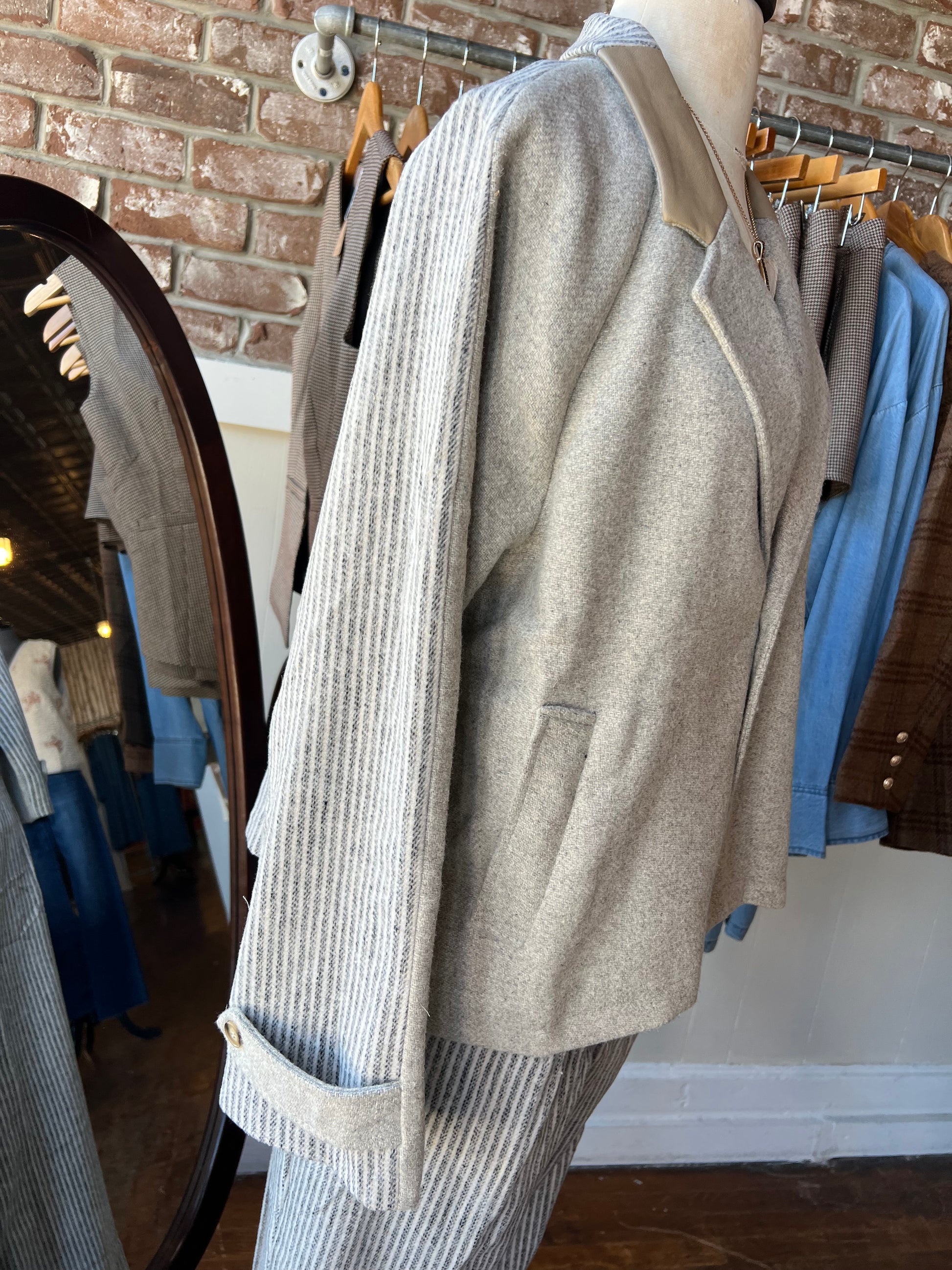 Discover the perfect blend of style and uniqueness with our Mixed Media Striped Jacket. Featuring a sleek gray body, a standout blue striped sleeve, and a warm tan collar, this jacket makes a bold statement while remaining effortlessly wearable. Designed to elevate your look, it combines eye-catching details with comfortable layering, making it a must-have addition to your fashion collection. Be sure to check out our matching pants!