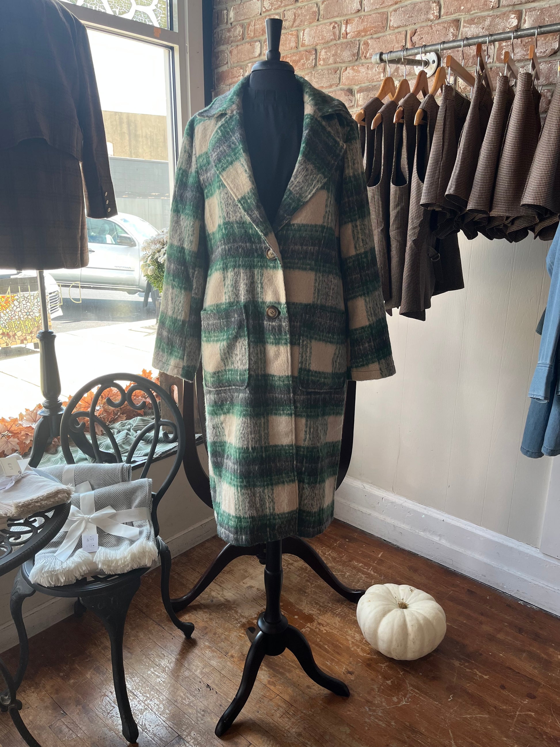 Make a bold statement with this vibrant gray and green plaid coat. Its striking pattern and rich colors bring fresh energy to your outerwear collection, while the cozy design ensures warmth and comfort. Perfect for standing out on chilly days with style and confidence.