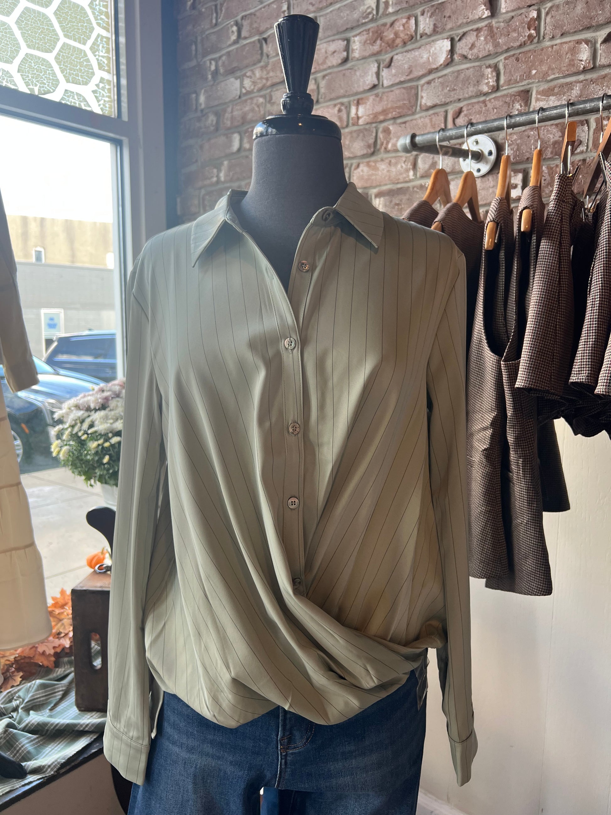 Striped Sage Green Button Up with Twisted Front