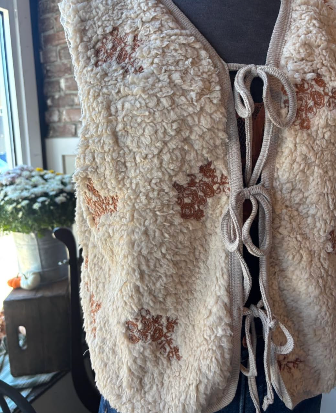 Stay cozy and stylish with this tan sherpa vest, featuring warm rust-colored embroidered accents and convenient front ties. Perfect for layering on cool days, it combines comfort with a touch of rustic charm to elevate your casual look effortlessly.